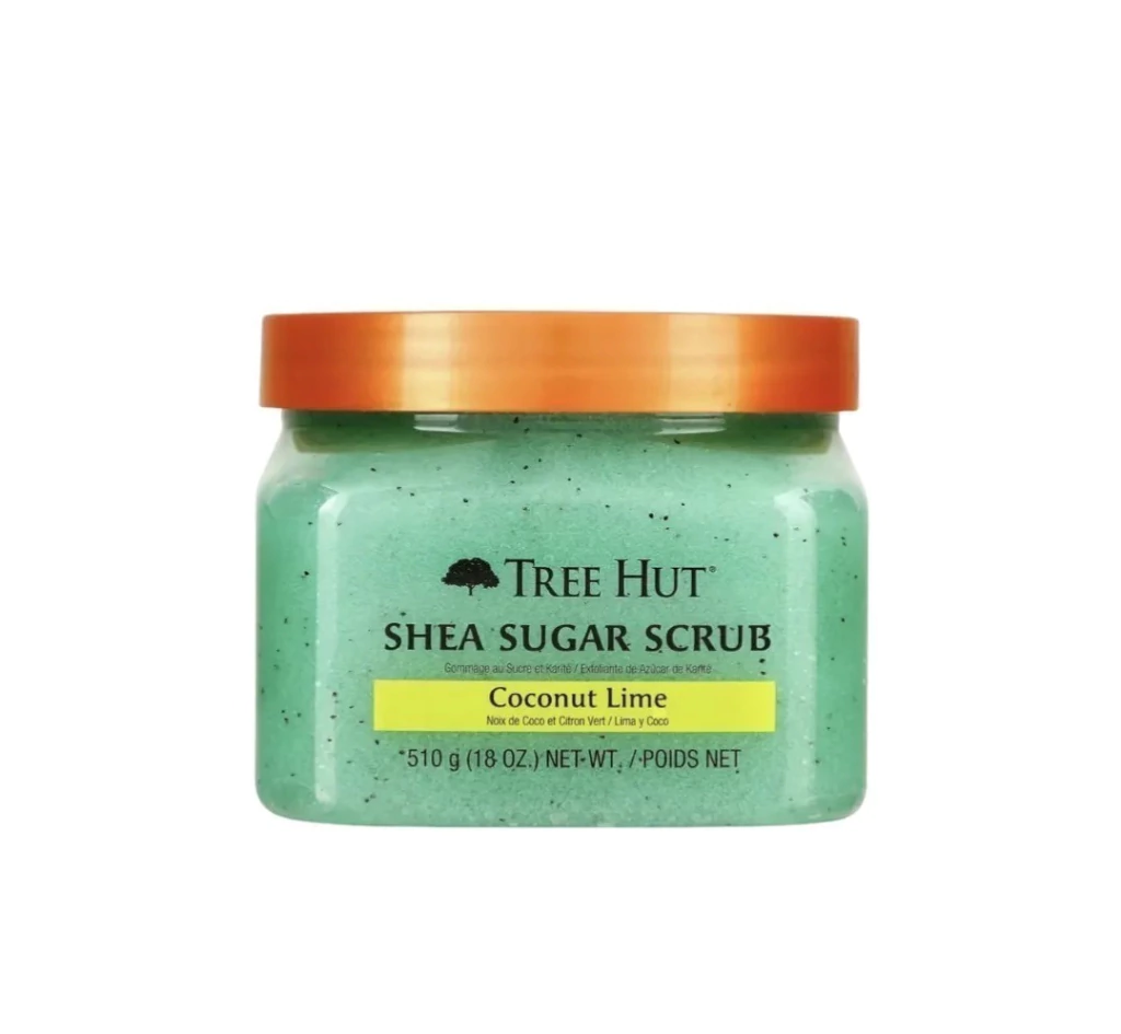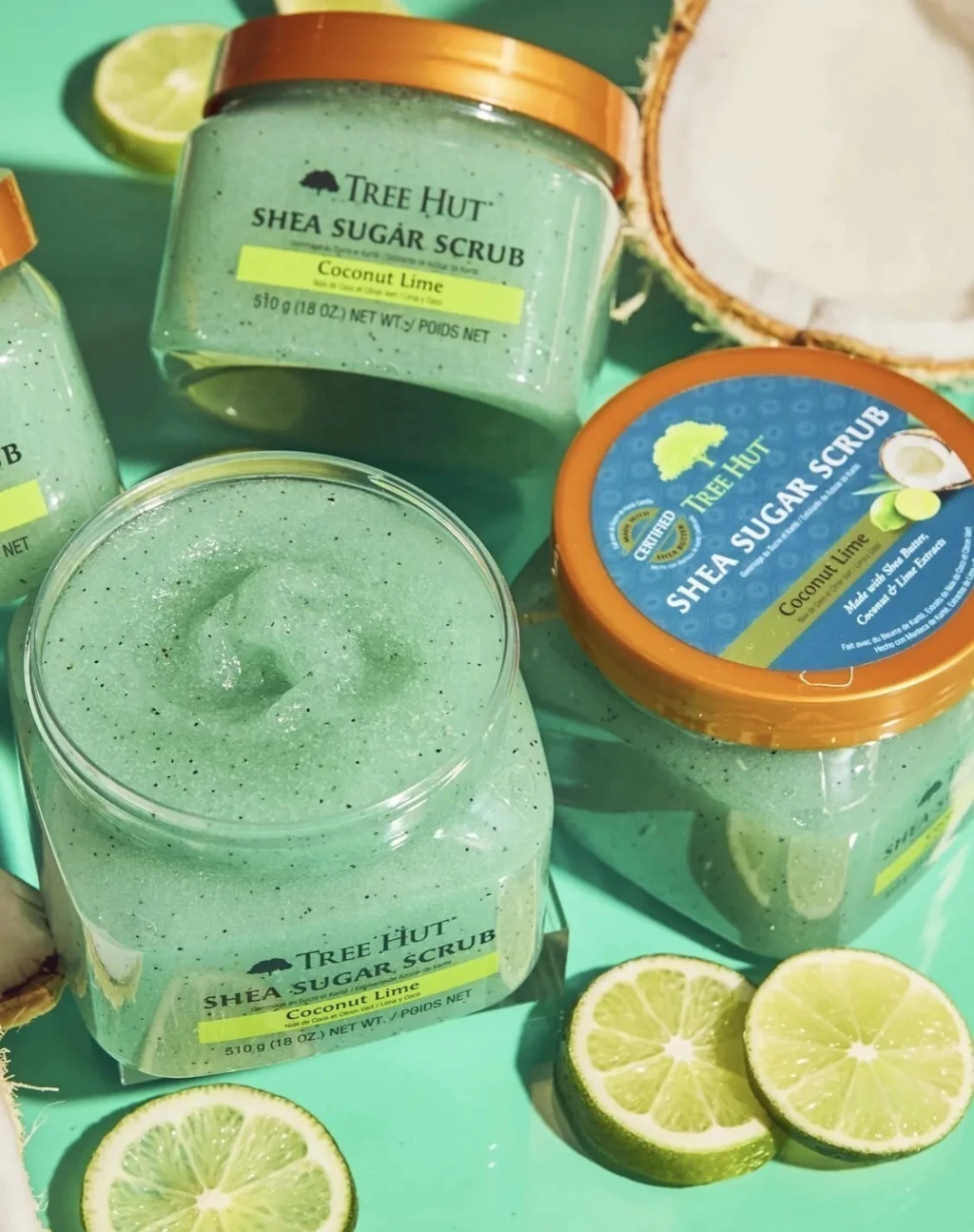 Tree Hut E os responsáveis pela esfoliação são os grãos de açúcar, esfoliante natural que remove as células mortas e renovam a pele do corpo, além de ajudar a aumentar a circulação na superfície da pele.