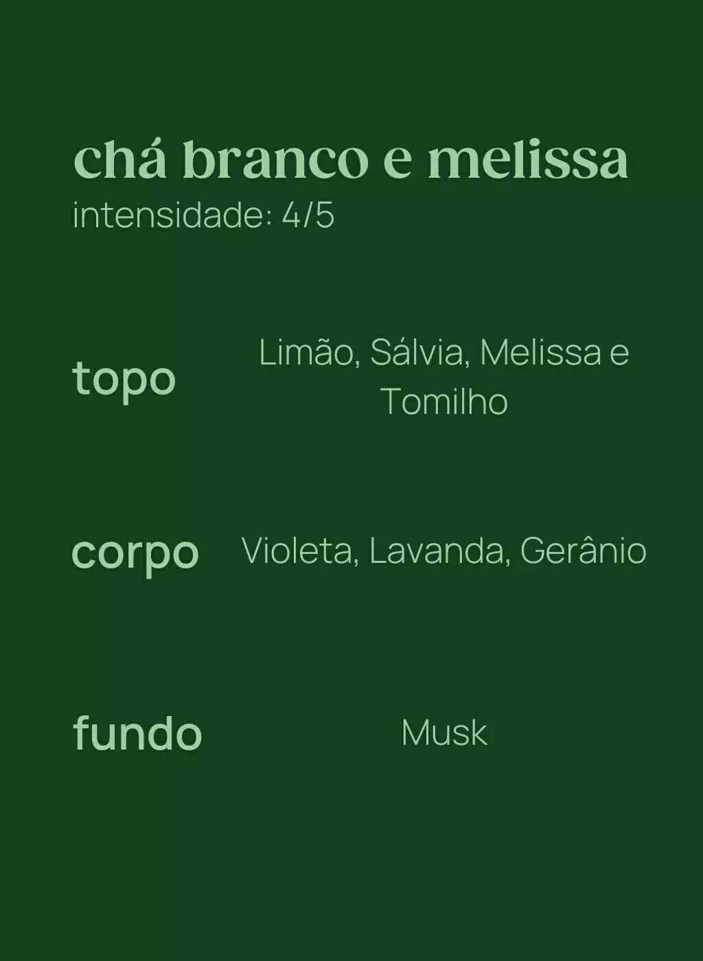 Chá branco e Melissa é uma fragrância elegante e fresca, perfeita para criar uma atmosfera tranquila e delicada. Com suas notas florais e herbais, esse aroma proporciona um ambiente sereno e harmonioso, ideal para quem busca uma sensação de leveza e frescor.Sua família olfativa combina a sofisticação das notas verdes com a suavidade floral, tornando essa fragrância única e revigorante.