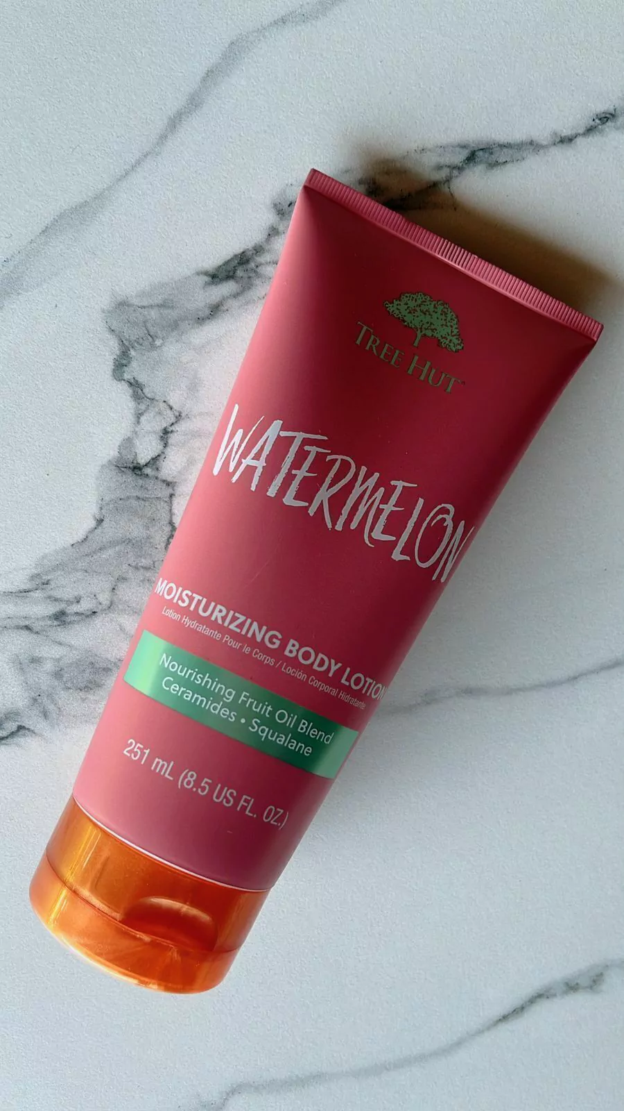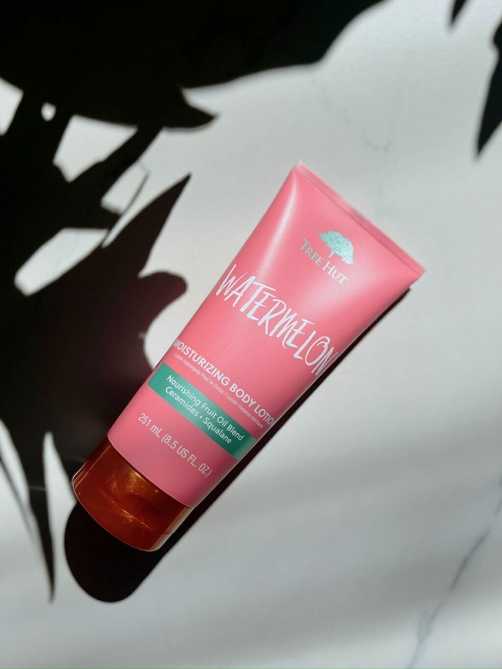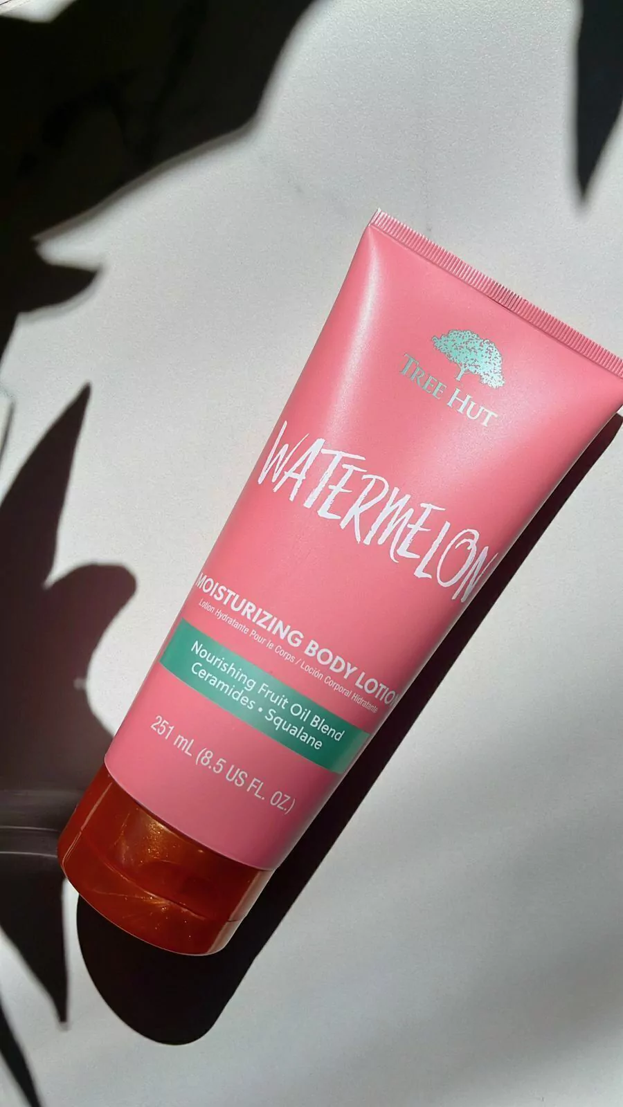 A Watermelon Moisturizing Body Lotion da Tree Hut apresenta uma fórmula de peso médio repleta de ceramidas e esqualano para ajudar a hidratar