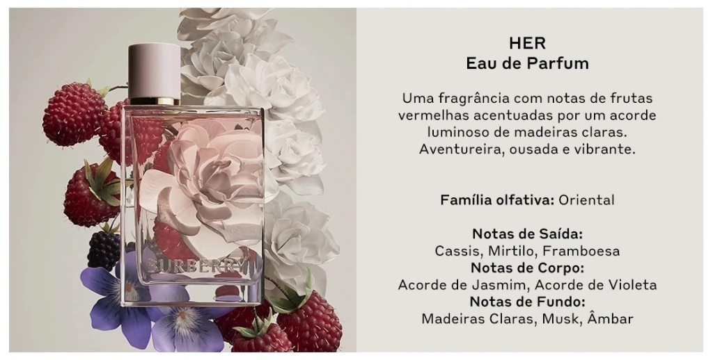 O perfume feminino Burberry Her Eau de Parfum é o primeiro gourmand com o toque britânico da Burberry.