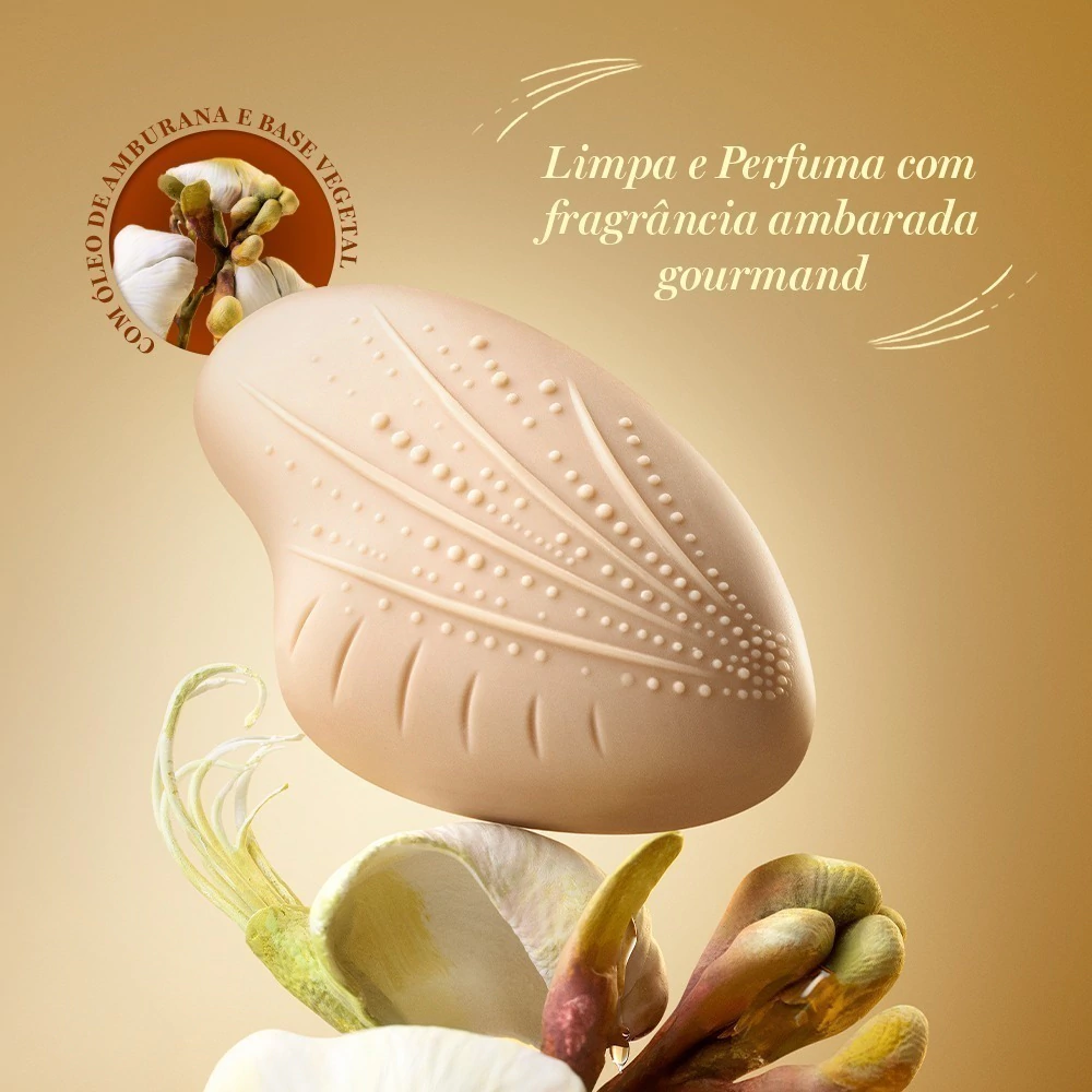 Deixa a pele limpa e perfumada com uma fragrância ambarada gourmand floral;