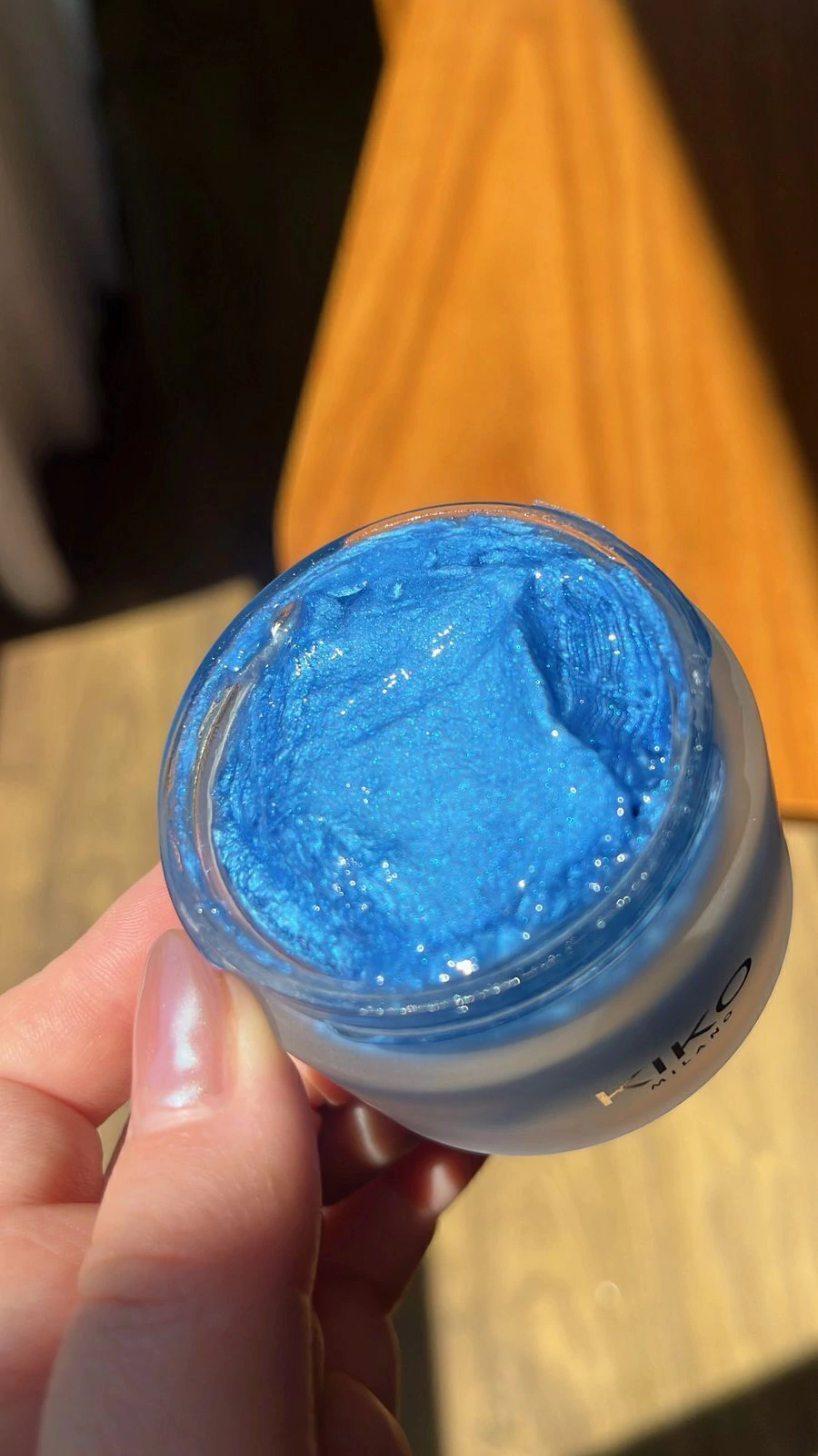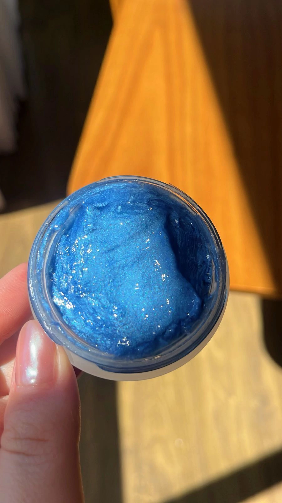 -a sua textura preciosa e cintilante em creme roxo e azul tem uma fragrância floral delicada e um aroma irresistível de manteiga de cacau;