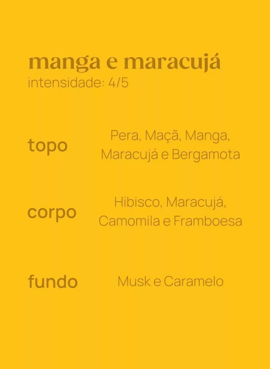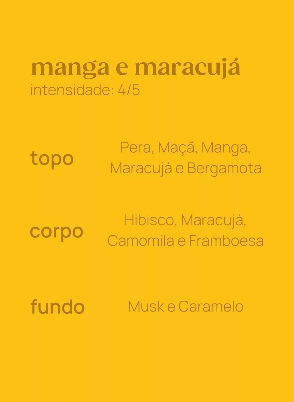 Manga e Maracujá é uma fragrância tropical, doce e refrescante, perfeita para os dias mais quentes do ano. Com uma combinação vibrante de notas frutais, ela traz o frescor da bergamota e a doçura da maçã e da pera, complementada pelo toque tropical da manga e do maracujá. Essa mistura cria uma atmosfera leve e energizante, ideal para quem busca uma fragrância envolvente e revigorante.