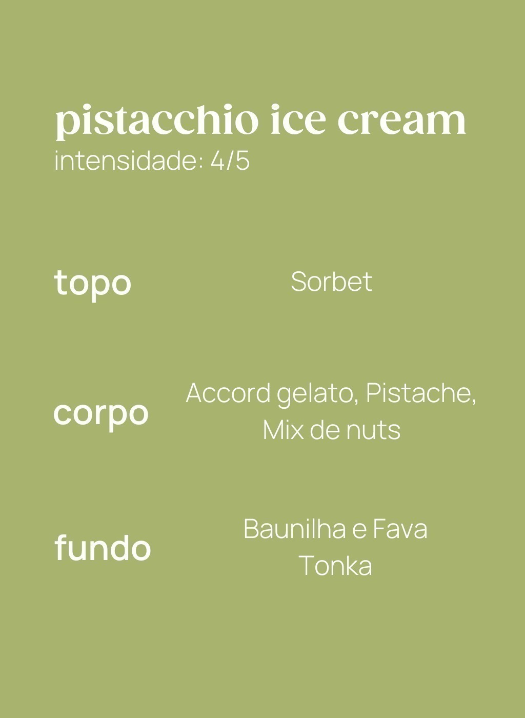 Pistacchio Ice Cream é a celebração do sabor que encantou o ano de 2024: o pistache. Inspirada na delícia de um sorvete cremoso de pistache, essa fragrância traz um equilíbrio perfeito entre notas de gelato, pistache, mix de nuts, sorbet e baunilha. Uma explosão de aromas que traz aquele clima gostoso de uma sobremesa gourmet, perfeita para os momentos doces e descontraídos do Natal!