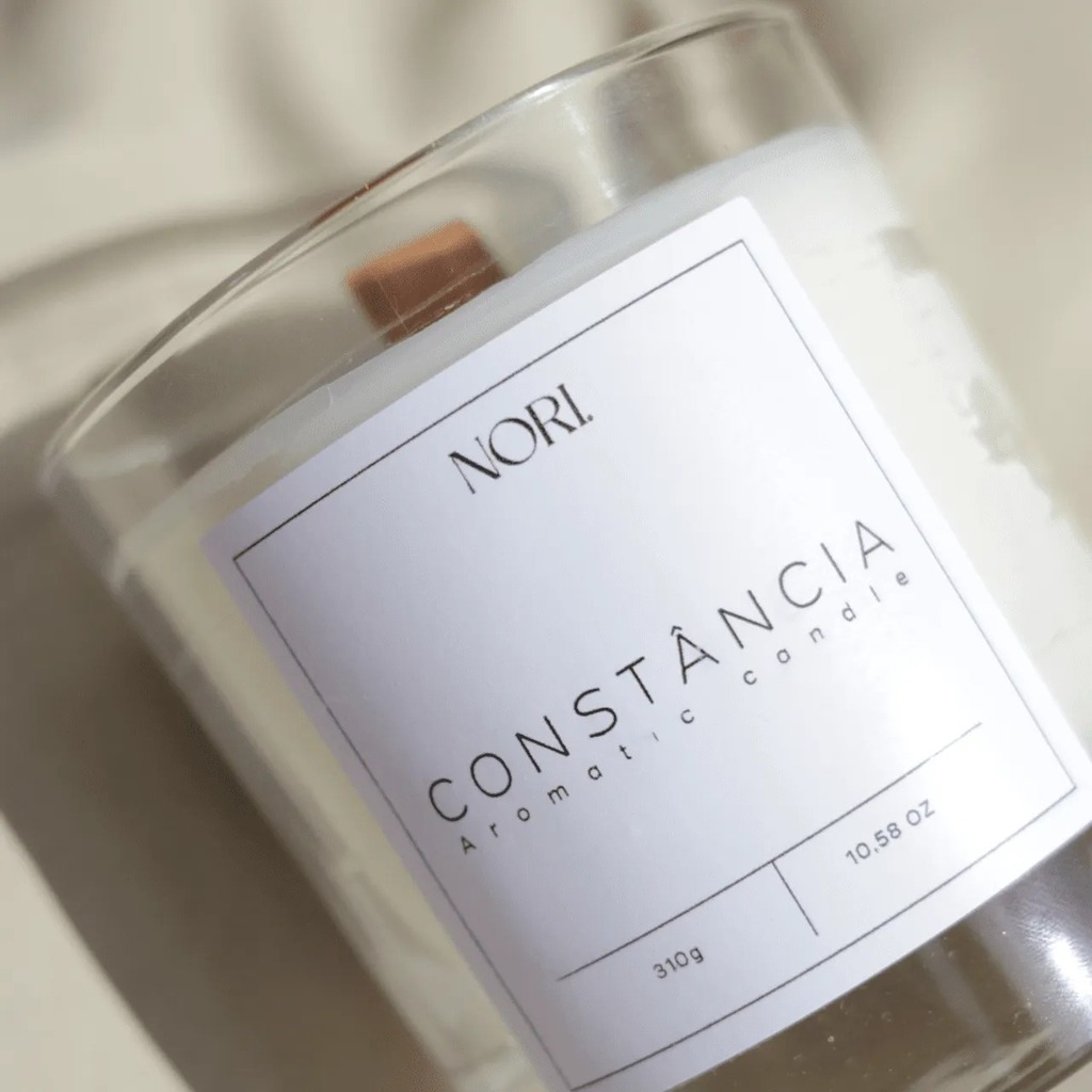 VELA C O N S T Â N C I A com pavio de madeira e frasco em vidro.